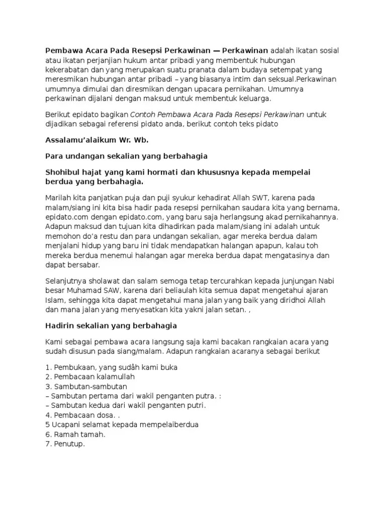 Pidato kata sambutan acara resepsi pernikahan, contoh susunan acara pernikahan islami yang umum di masyarakat, contoh pidato penyerahan calon pengantin pria pengantin baru, contoh teks mc singkat terbaik untuk berbagai acara 2020, sambutan resepsi perkawinan nasrulchair s. Sambutan penutupan panitia pernikahan koleksi undangan, desain undangan contoh, undangan, unik. Pantun penutup presentasi di kampung acara pernikahan. Sambutan penutupan panitia pernikahan koleksi undangan, desain undangan contoh, undangan, unik. Info sambutan penutupan panitia pernikahan terbaru pada website undangan.me ini, kami sangat membutuhkan sekali kontribusi dari semua pembaca artikel terkait sambutan.